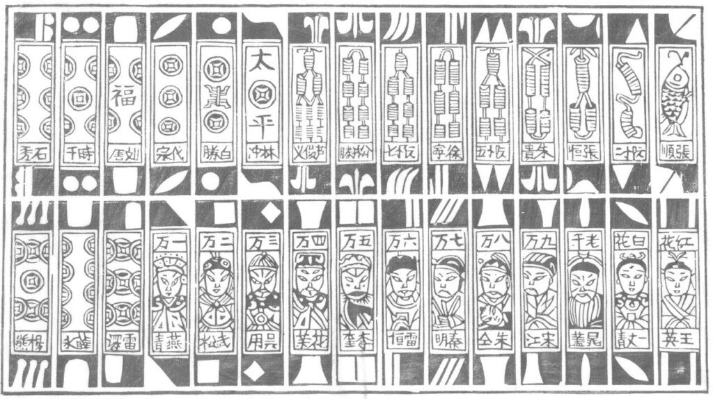 トランプと同じく4種のスートで構成されており「十字、万字、索子、文銭」おそらく「字牌、萬子、索子、筒子」というような変化をしていったのだろう。4種で40枚という事は各スートは10枚ずつなのか、といえばそうではない。十字門と文銭門は各11枚ずつ、万字門と索子門は9枚ずつという変則的な構成になっている。