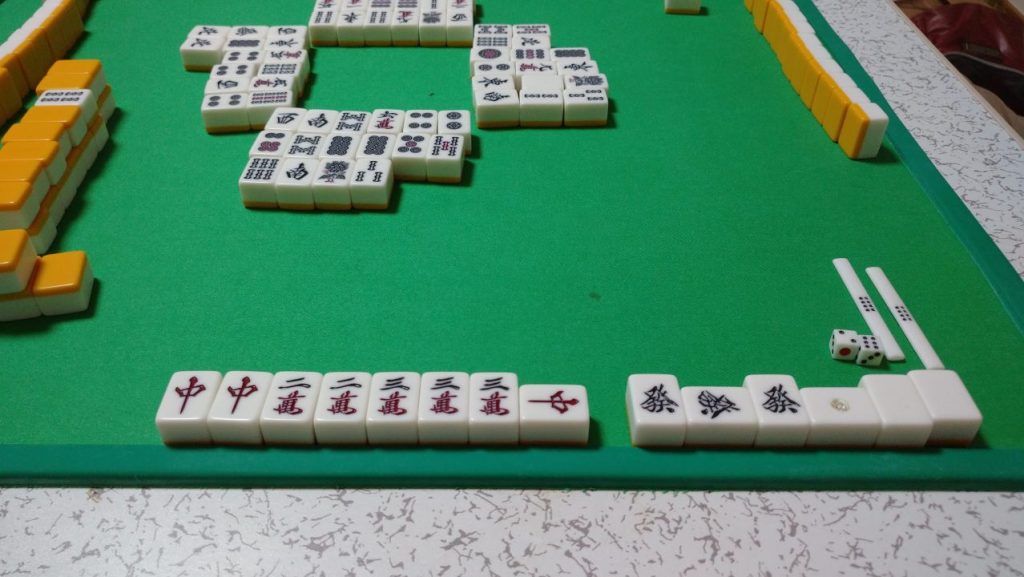さて、ここでポンポンポンと三回の鳴きが入ったとしよう。晒された牌は白・發・中。これはもう気軽に参加します、とは言ってられない状況だろう。このような状況で立直に行けるのはデータを完璧に覚えたAI人間か役を知らない初心者ぐらいだ。