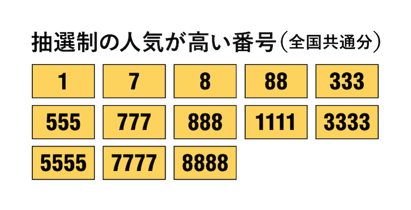 さてこちらは車のナンバープレートを取得する際に希望ナンバーを申請する時、抽選制になるとされる人気が高い番号である。連続形のものを避けて見てみると1、3、5、7、8の5種類が人気という事がわかる。奇数だけと思いきや9が入っていない所などは日本人らしい。また以下のような文言もある。