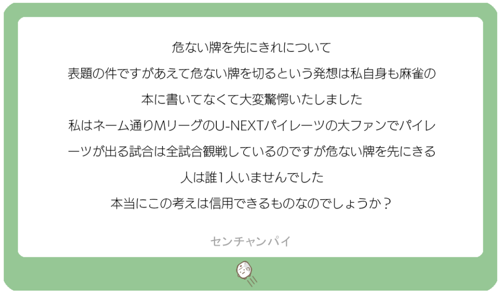 少し前に投稿した「オリてる途中に安牌が無くなった? そんな時に通るのは「一番危険な牌」」へのリアクションセンチャンパイを頂きましたので答えていきたいと思います。