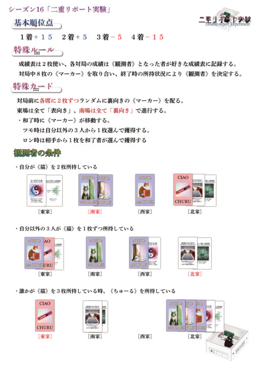 東場はマーカーが公開された状態で対局が進むが、南場は非公開となる。箱の中身の猫は最後に開けるまではわからない。各猫の名前は「まぐろ」「シャーリー」「わさび」である。